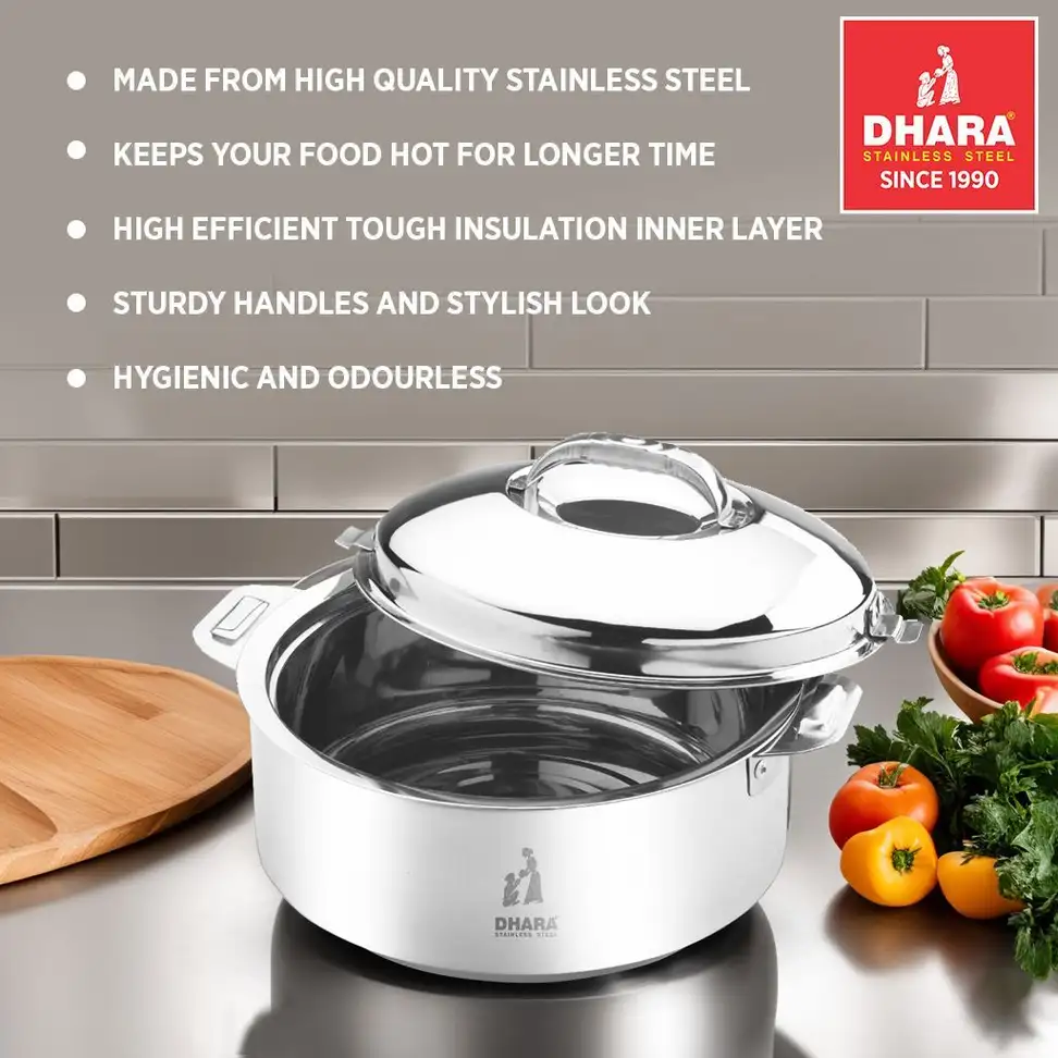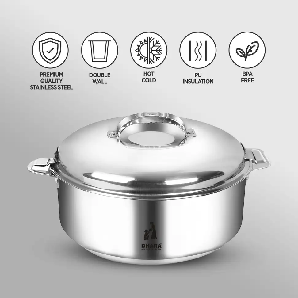 Dhara Ultra Hotpot is a great way to enjoy a variety of fresh ingredients, The hotpot both helps to infuse flavors into the ingredients, keeping a delicious and satisfying meal. This Dhara casserole is made from high-quality stainless steel that is resistant to rust and corrosion, making it highly durable and long-lasting. The lid of the hot pot fits tightly and securely, preventing any moisture or heat from escaping. It is also leak-proof. The casserole has a comfortable handle grip that provides a secure and easy grip while carrying. The handle is made from heat-resistant material, so you can safely carry even when it’s hot. The Dhara stainless steel casserole is hygienic and odorless, which means that it does not retain any food odors or bacteria, making it safe for use. It is also easy to clean and maintain, as it is dishwasher safe.